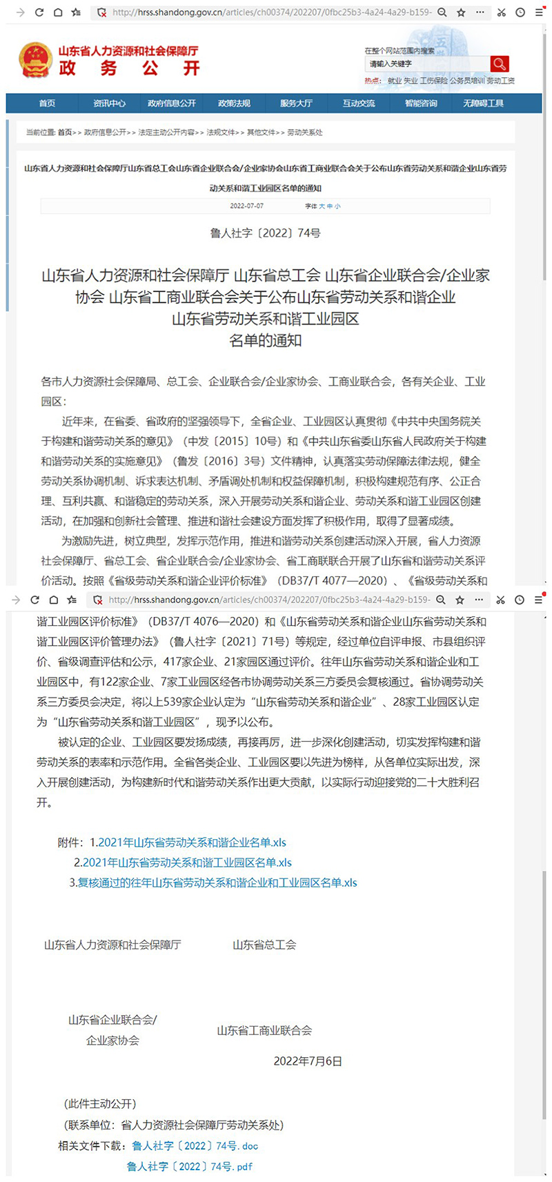 乳山市水利工程有限公司榮譽(yù)2021年山東省勞動(dòng)關(guān)系和諧企業(yè)
